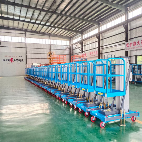 铝合金式升降平台采用液压油缸、链条联运形式实现作业平台的举升。